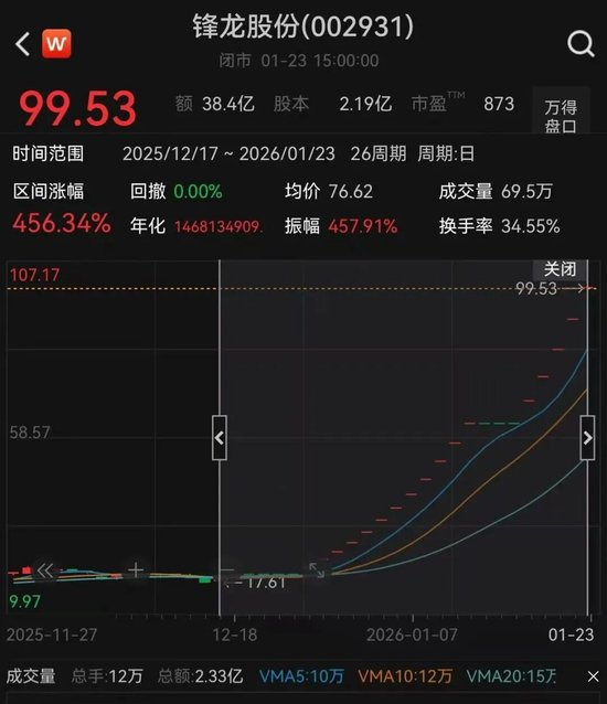 盘面上,截至23日收盘,锋龙股份再度涨停,走出18连板行情。本轮行情自2025年12月17日启动,期间累计涨幅超450%。