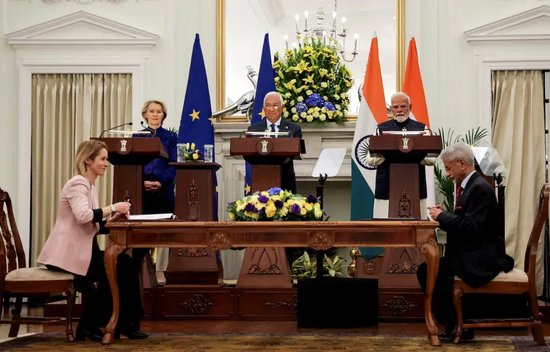 欧盟主席冯德莱恩周二在社交平台X上表示:“我们达成了史上最伟大的协议。”她说,双方打造了一个覆盖20亿人口的自由贸易区,欧印双方都将受益。冯德莱恩与欧洲理事会主席安东尼奥·科斯塔目前正在新德里,出席相关活动。