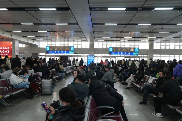 候车室内人头攒动,旅客正在候车。