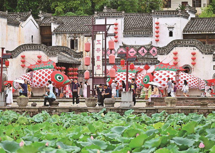 游客在安徽黄山市徽州区呈坎村体验非遗鱼灯。新华社发