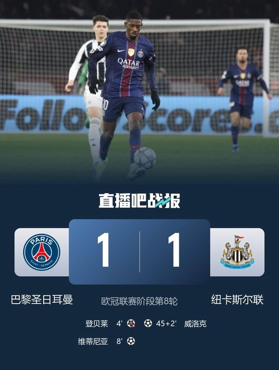 直播吧1月29日讯 北京时间1月29日04:00,欧冠联赛阶段第8轮巴黎迎战纽卡的比赛在王子公园球场进行,上半场巴尔科拉开场造点,登贝莱点球被波普扑出,维蒂尼亚远射首开记录,K77伤退,丹伯恩助攻威洛克头球扳平,下半场双方均无建树,最终巴黎1-1纽卡排名欧冠联赛阶段第11将战附加赛,纽卡排名第12也进入附加赛。