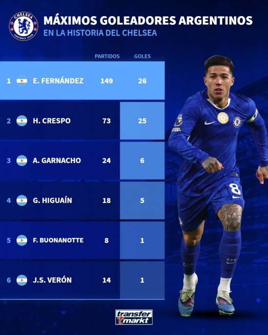 恩佐为切尔西打进26球超越克雷斯波,成为队史进球最多阿根廷球员